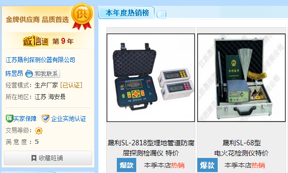 江蘇晟利探測儀器有限公司經(jīng)過阿里巴巴官方就資質(zhì)、服務(wù)、產(chǎn)品等多方面嚴(yán)格審核,2014年榮獲阿里巴巴“金牌供應(yīng)商”稱號(hào)。再次證明了我公司在行業(yè)內(nèi)的領(lǐng)導(dǎo)品牌地位,同時(shí)也說明我公司產(chǎn)品質(zhì)量和服務(wù)得到了業(yè)內(nèi)和廣大消費(fèi)者的認(rèn)可。
