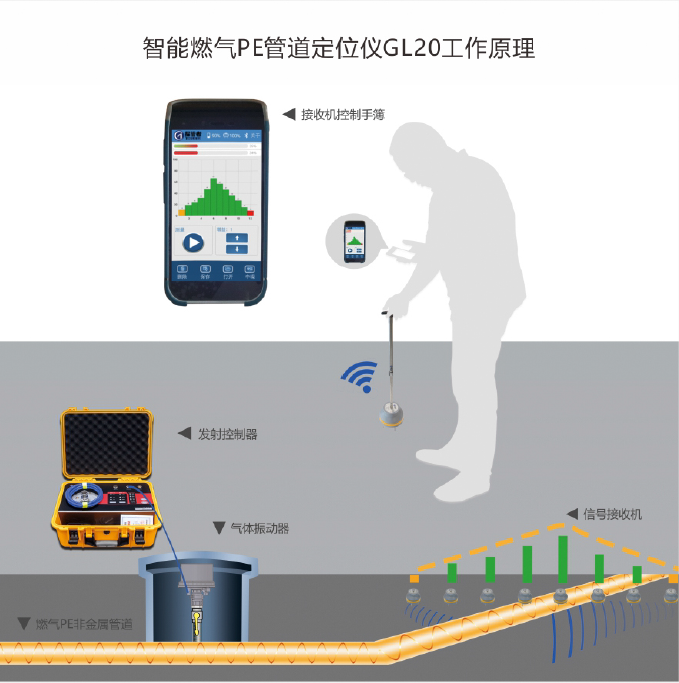 智能燃?xì)?/span>PE管道定位儀SL20由發(fā)射機(jī)部分相接收機(jī)部分組成,發(fā)射機(jī)部分包括發(fā)射控制器和氣體振動器 ,接收機(jī)部分包括接收機(jī)及其控制手簿和伸縮提桿。氣體振動器通過與管道放散閥連接連通到天然氣管道上
