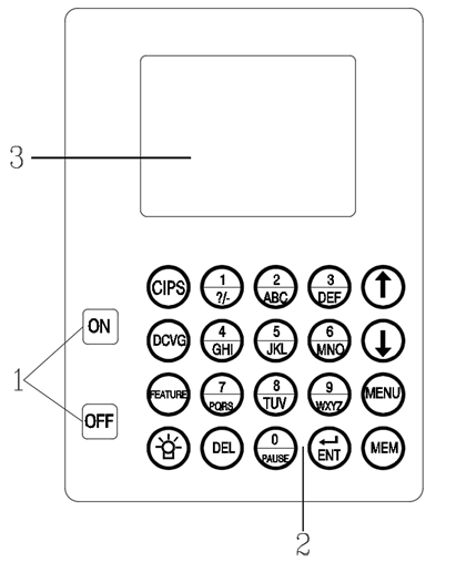 1電源開關鍵;2、鍵盤區(qū);3、顯示屏;