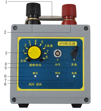 (1)把手;(2)輸出端子;(3)模式選擇開關;(4)GPS信號輸入;(5)充電插孔;(6)輸出指示燈;(7)衛(wèi)星同步指示燈;(8)電源指示燈。