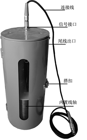 尾線計距儀裝置是一個圓柱形筒狀,背包式,內(nèi)部安裝有帶金屬銅線的線軸、計距輪。尾線通過尾線出口拖出與測試樁處的管道電纜相連接。尾線的另一端必須連接到線軸的固定桿上,再通過連接線與記錄儀的計距儀輸入端口相連接。